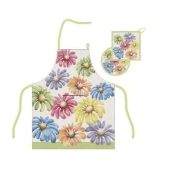 Ai fornelli la donna ha bisogno del suo grembiule e delle sue presine in coordinato. Il set Iole è perfetto per chi ama i fiori e il colore in casa, soprattutto in cucina.