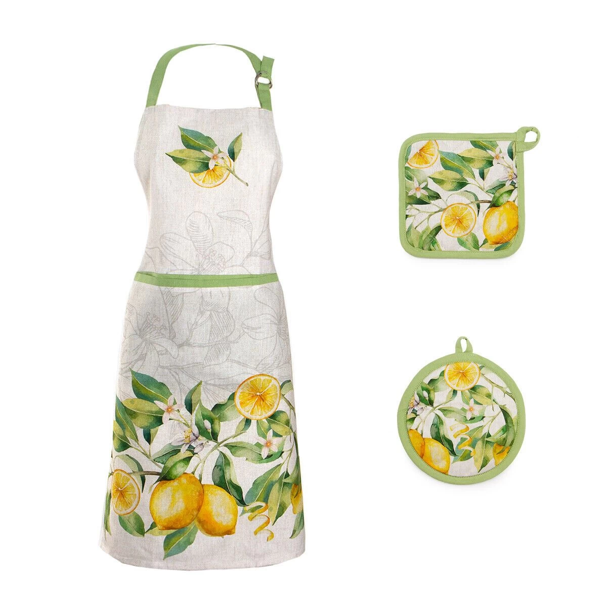 | Dettagli | La confezione comprende un set da cucina composto da: 1 presina forma quadrata 1 presina forma rotonda 1 grembiule Presine dotate di appendino Grembiule con ampia tasca anteriore e laccetti Stampa digitale ad alta definizione con limoni Puro cotone, resistente ai numerosi lavaggi Disegnato e progettato in Italia |