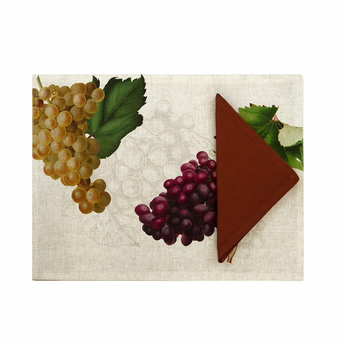 | Dettagli | La confezione contiene un set americano composto da: 1 tovaglietta all’americana 1 tovagliolo Stampa digitale con grappoli d’uva Colore del tovagliolo in coordinato con il retro della tovaglietta Coordinabile con altri articoli Disegnato e progettato in Italia |