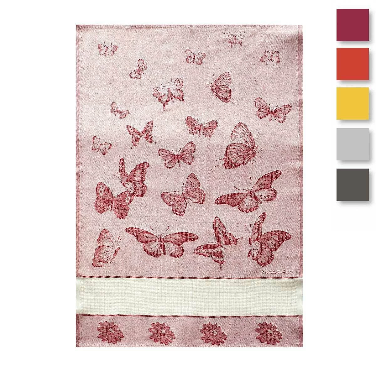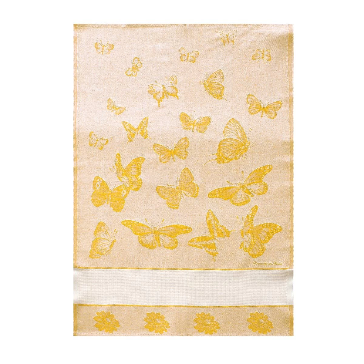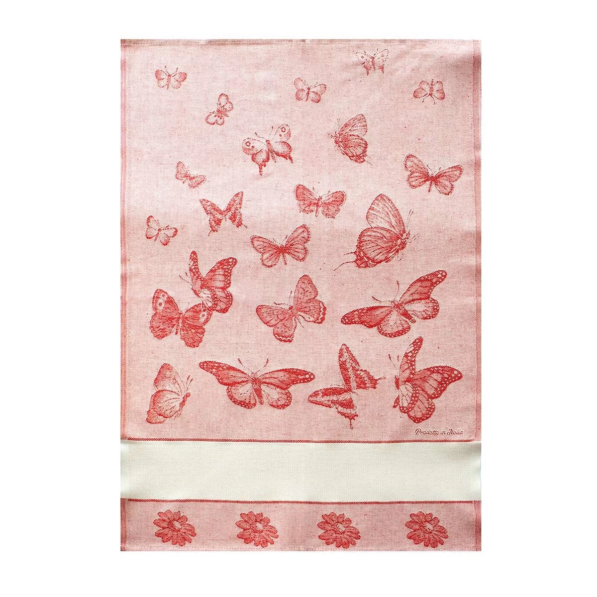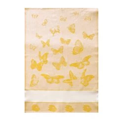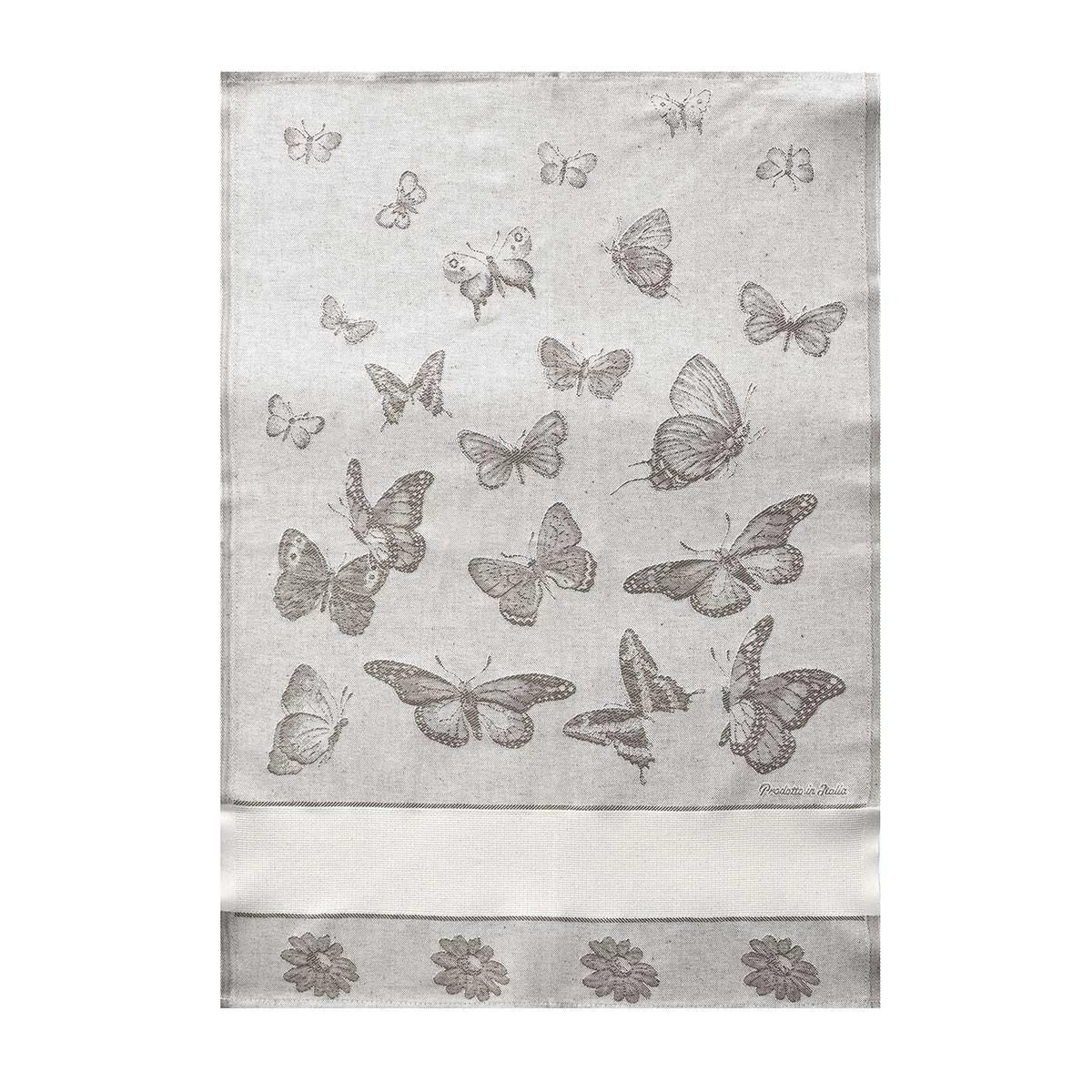 Tante farfalle tono su tono caratterizzano questo strofinaccio, realizzato in lino e cotone per avere una massima assorbenza ed utilità in cucina.