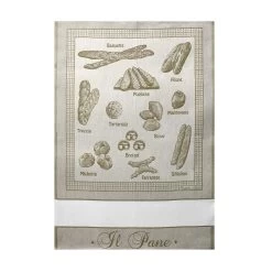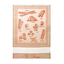 Il pane è uno dei prodotti alimentari più mangiati e apprezzati a tavola, realizzabile in tanti modi e gusti diversi. Li ritroviamo quasi tutti rappresentati sul questo utile e comodo strofinaccio in cotone.