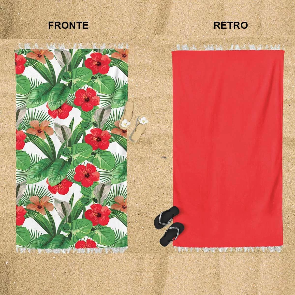| Dettagli | La confezione contiene un telo per il mare e/o la piscina Parte anteriore in microspugna cimata con stampa tropicale Retro tinta unita in microspugna a riccio Frange poste all’estremità del telo Utilizzabile anche come pareo Morbida e soffice microspugna di cotone Leggero, pratico e salvaspazio |