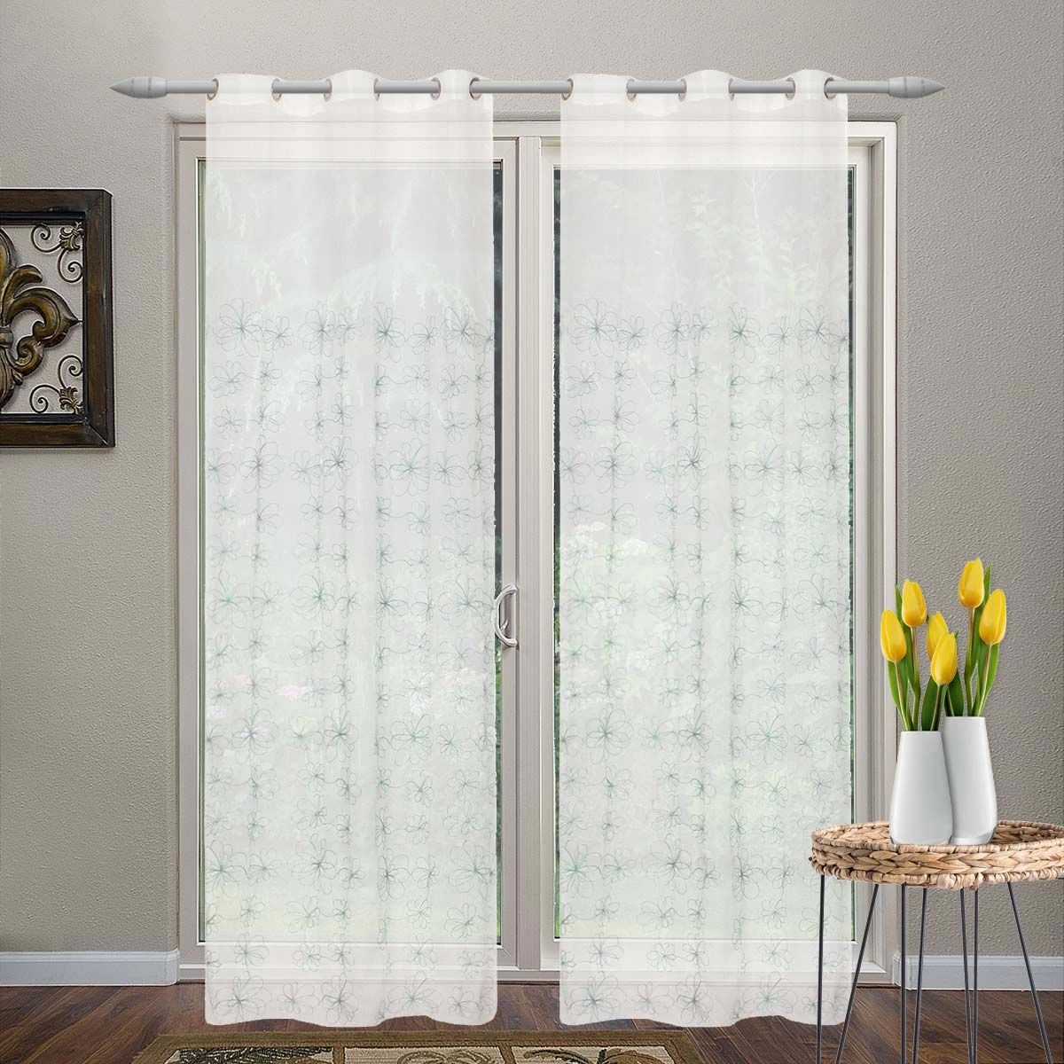 | Dettagli | La confezione contiene una tenda Motivo ricamato floreale Tessuto filtrante (semitrasparente) che lascia passare la luce, permette di guardare fuori ma allo stesso tempo garantisce la giusta privacy Tenda confezionata con 6 anelli (borchie) metallici di colore argento Diametro interno borchia 40 mm Completamente rifinita, pronta per essere montata |