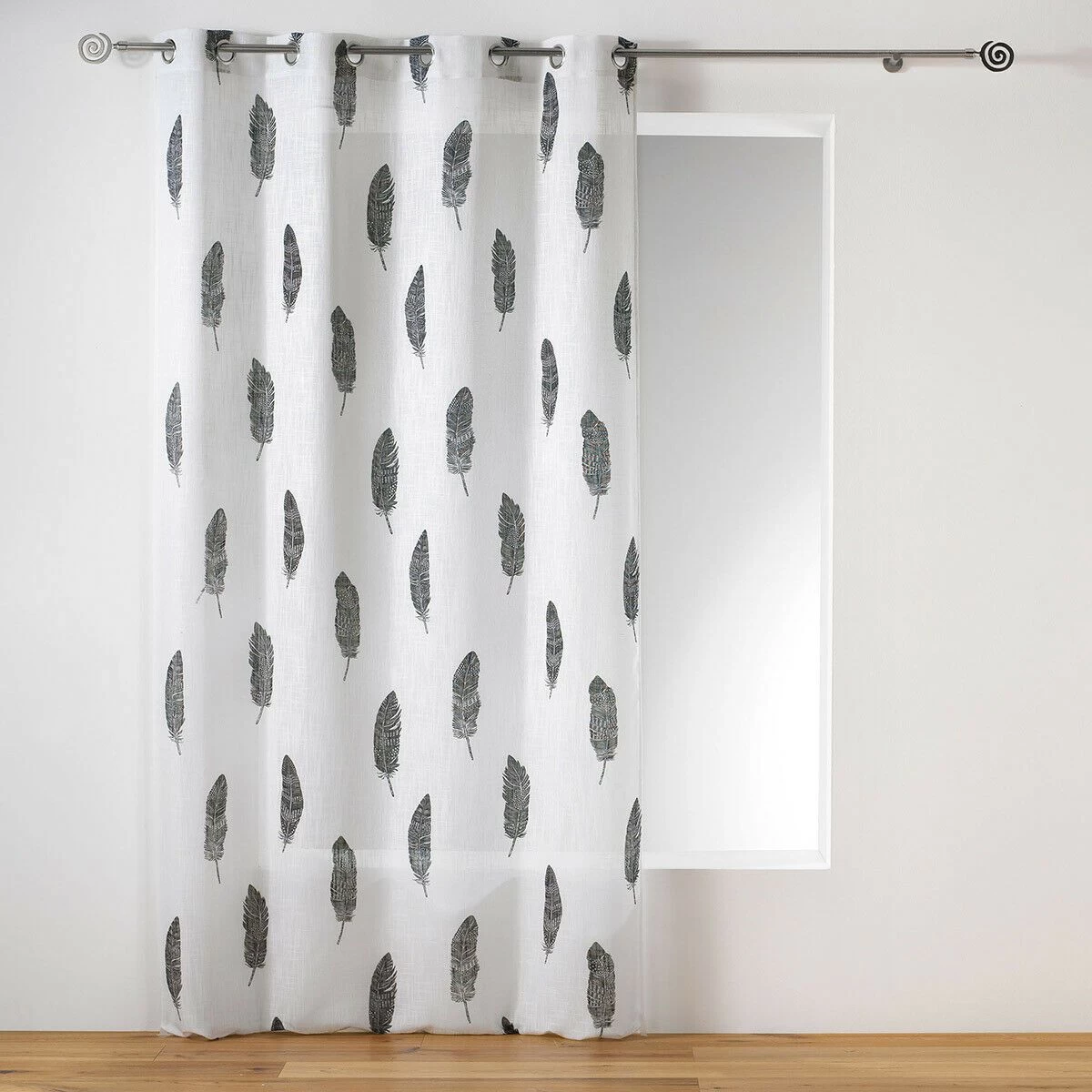 Delle piume in contrasto di colore fanno da motivo per la tenda arredo Eternity, leggera e semitrasparente renderà l’ambiente luminoso proteggendone la privacy.