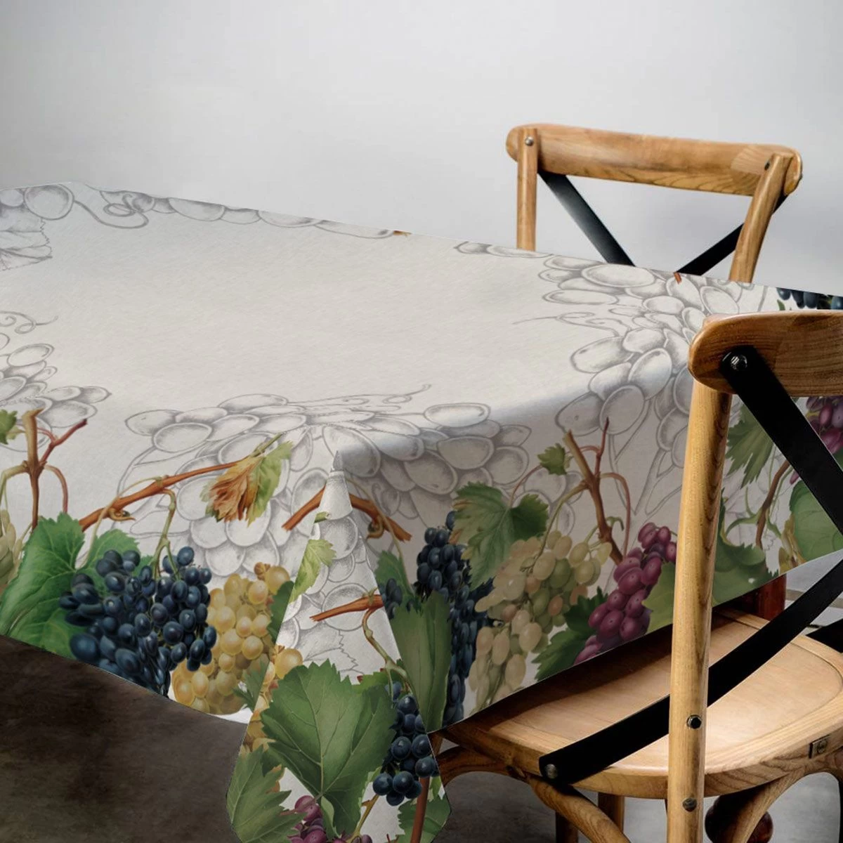 Da sempre un prodotto importante della produzione italiana, l’uva riempe i vigneti con i suoi colori profondi e splendenti, e potrà fare lo stesso con il tuo tavolo grazie alla tovaglia Vigna. Realizzata in puro cotone, presenta una stampa digitale che raffigura vari tipi d’uva.