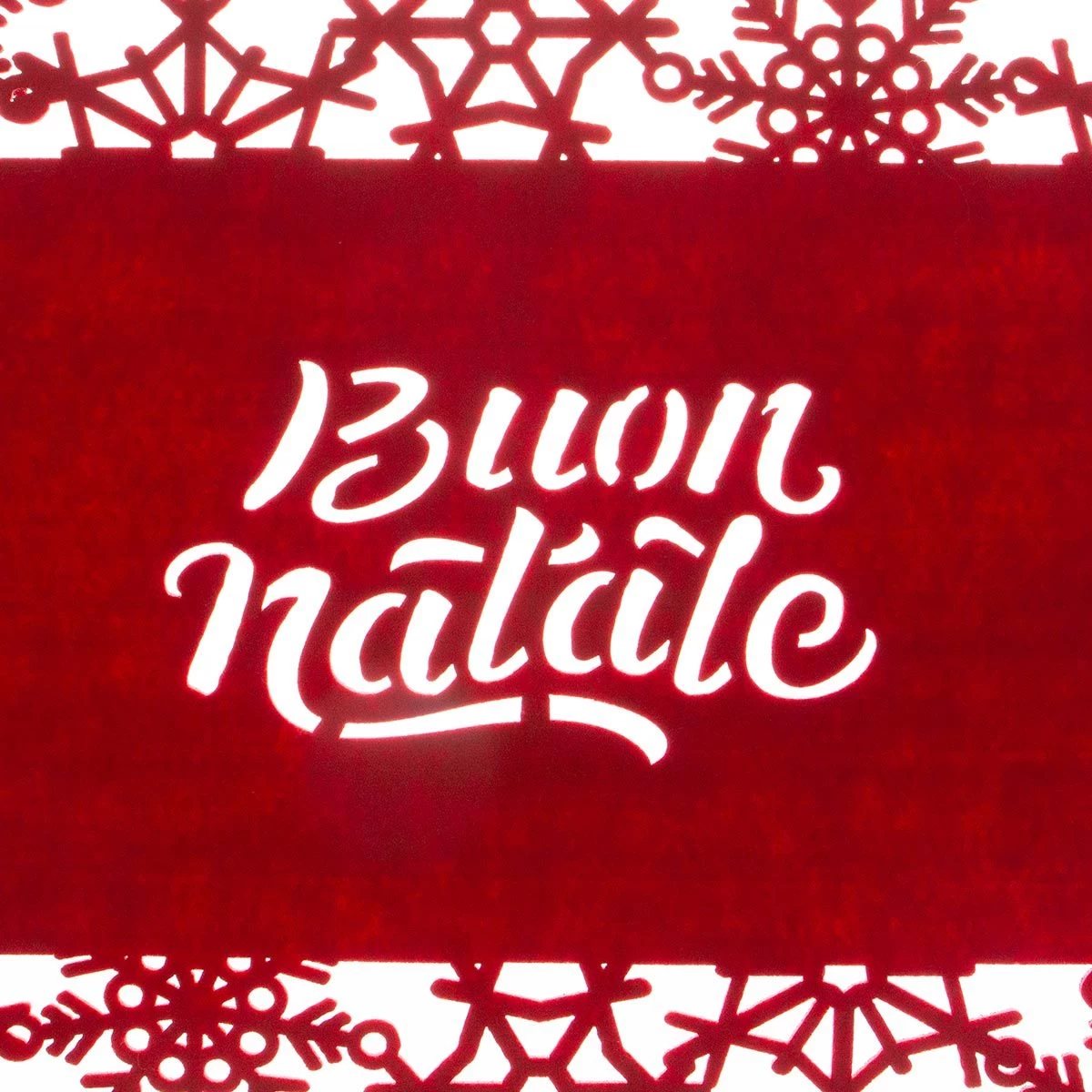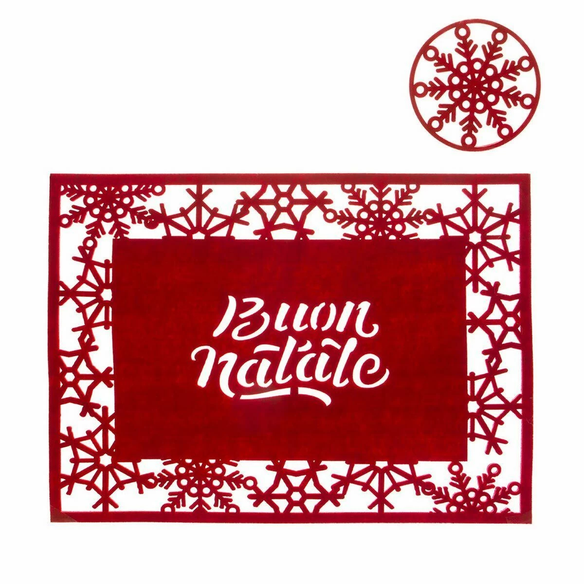 | Dettagli | La confezione comprende: 1 tovaglietta rettangolare 1 sottobicchiere rotondo Realizzati in feltro Intagliati con scritta “Buon Natale” al centro e fiocchi di neve ai bordi Ideale da usare per preparare la tavola nelle festività natalizie |