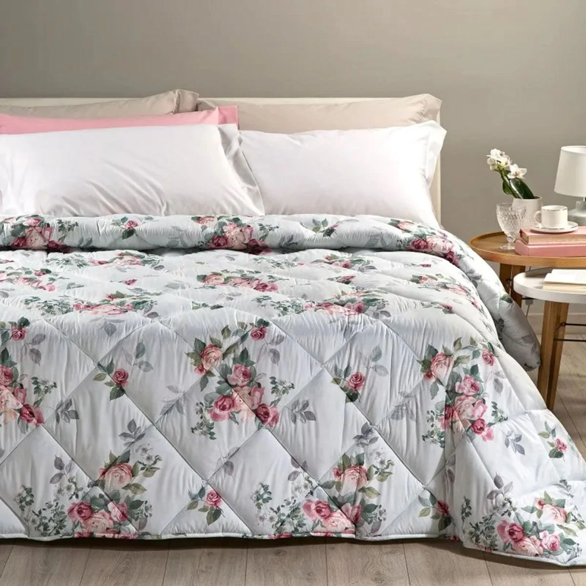 Delicata ed elegante, la trapunta Belfiore di Caleffi porta romanticismo nella stanza e riscalda le notti invernali con la sua realizzazion in cotone, con retro in microfibra e imbottitura in fibra di poliestere anallegica e antibatterica, morbida, soffice e comoda.