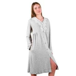 | Dettagli | La confezione contiene una vestaglia da donna a manica lunga Apertura sul davanti con scollo a V Bottoni tondi in tessuto Applicazioni di rouches in raso lungo lo scollo e decoro in pizzo rebrodè Taglio impero sotto il seno con arricciatura Gonna a campana che non segna la figura e nasconde le imperfezioni Ideale anche per donne in dolce attesa o per l’allattamento Confezionato in una scatola stampata Made in Italy |